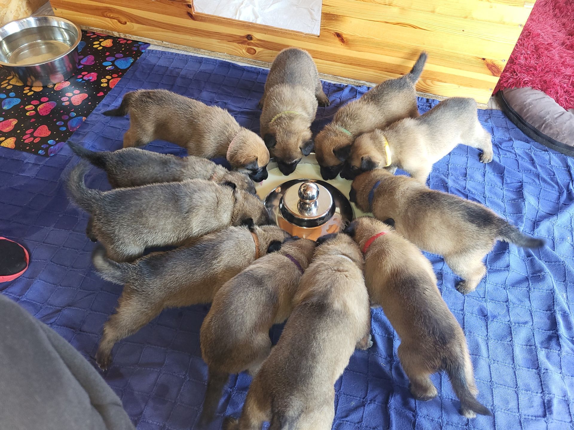 Da es in der Wurfkiste dafür ziemlich eng geworden ist, durfte die Rasselbande in das Welpenzimmer ausziehen. Dort haben die Lütten erstmalig alle zusammen Milchbrei geschleckert.